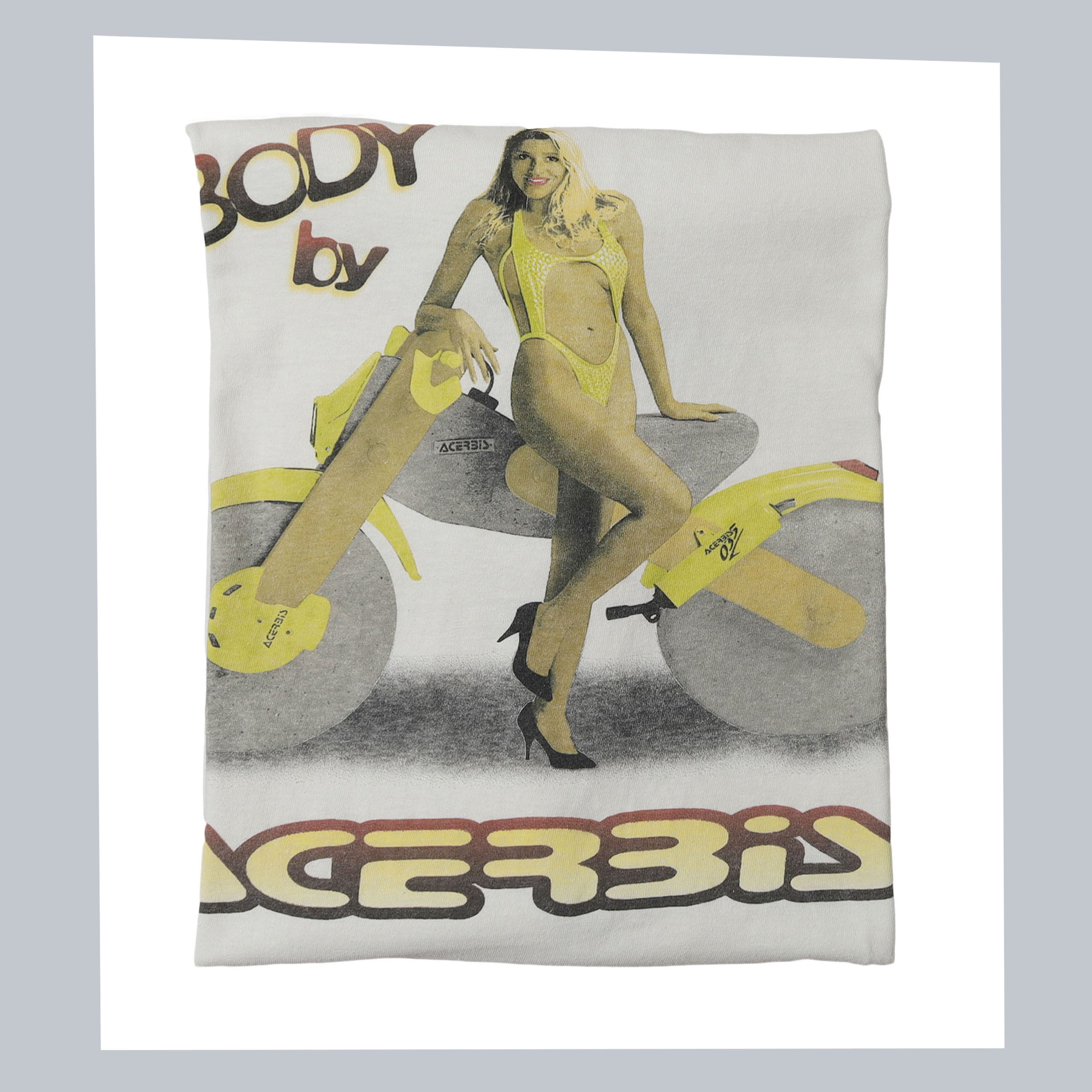 イタリアのオートバイ用品や自転車用品のメーカー "ACERBIS(アチェルビス)" のTシャツ。バックプリントが最高にかっこいいデザインで、滅多に出てこない超レアな1枚。この手のデザインは海外の評価の高い印象で、買い付けられないくらい高いものが多いです。プリントの大きさもインパクト抜群で、イエローベースのカラーリングも最高です。