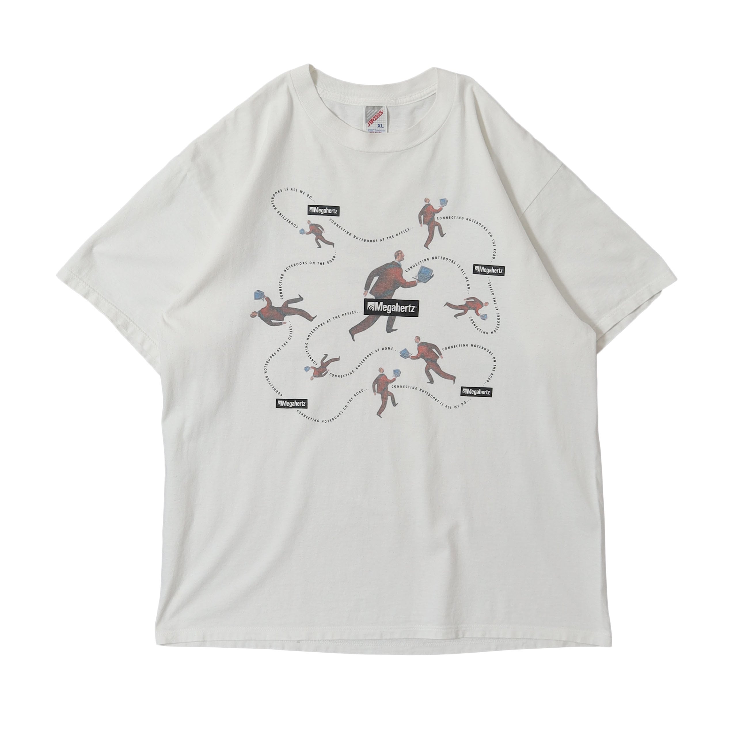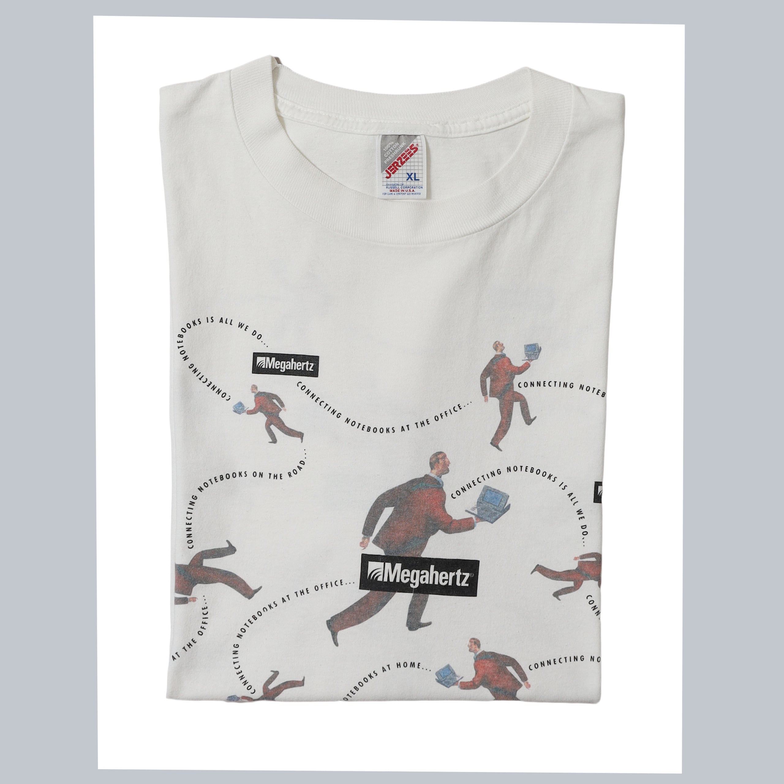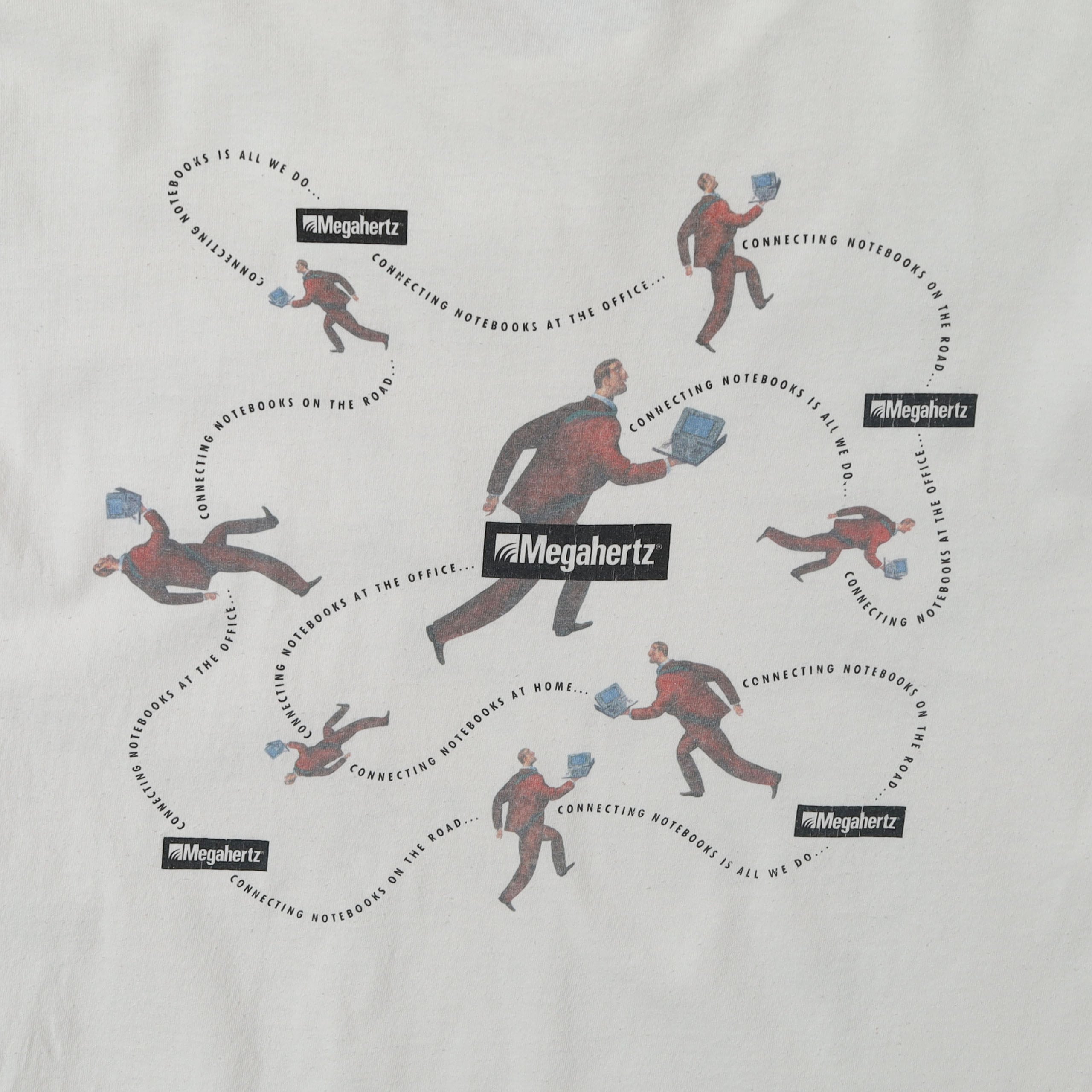 かつて存在したアメリカのテクノロジー企業 "Megahertz (メガヘルツ)" のプロモTシャツ。恐らくモデムの製造や販売がメインの企業です。このTシャツは今年のPOP UPで一度買い付けて以降ずっと探していた1枚。他の企業Tとは一線を画す雰囲気のデザインがめちゃくちゃ洒落ていて、個人的にも大好きなデザイン。しっかりとプリントはあるものの、派手すぎない絶妙なバランスも魅力的な1枚です。