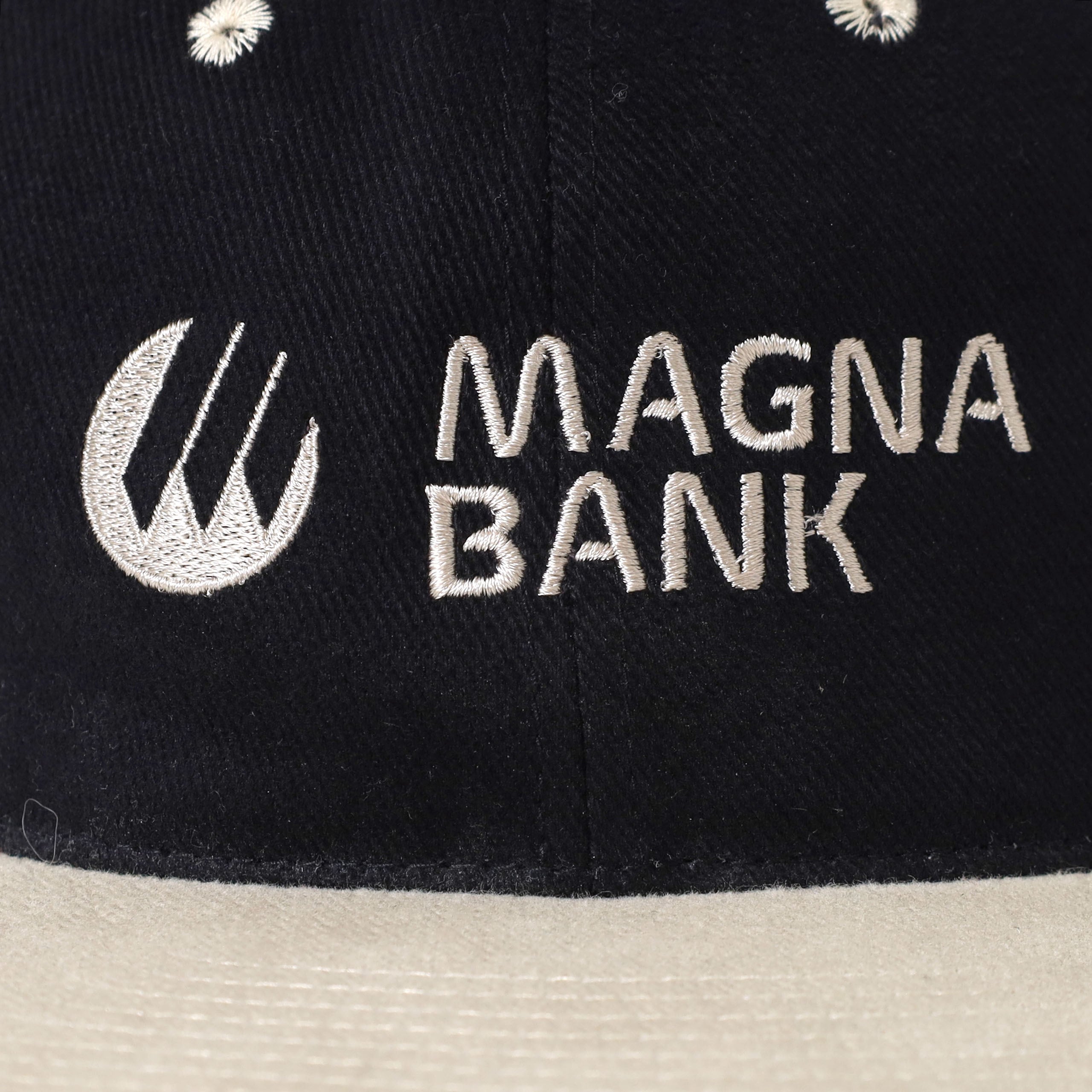 かつて存在したメンフィス拠点の銀行 "MAGNA BANK" のプロモキャップです。ロゴだけのシンプルなデザインですがロゴのデザインも良く、馴染みのない銀行ですので、クセなく使ってもらえるかと思います。クラウンがブラックでバイザーがベージュというのも、意外と見ないカラーリングです。
