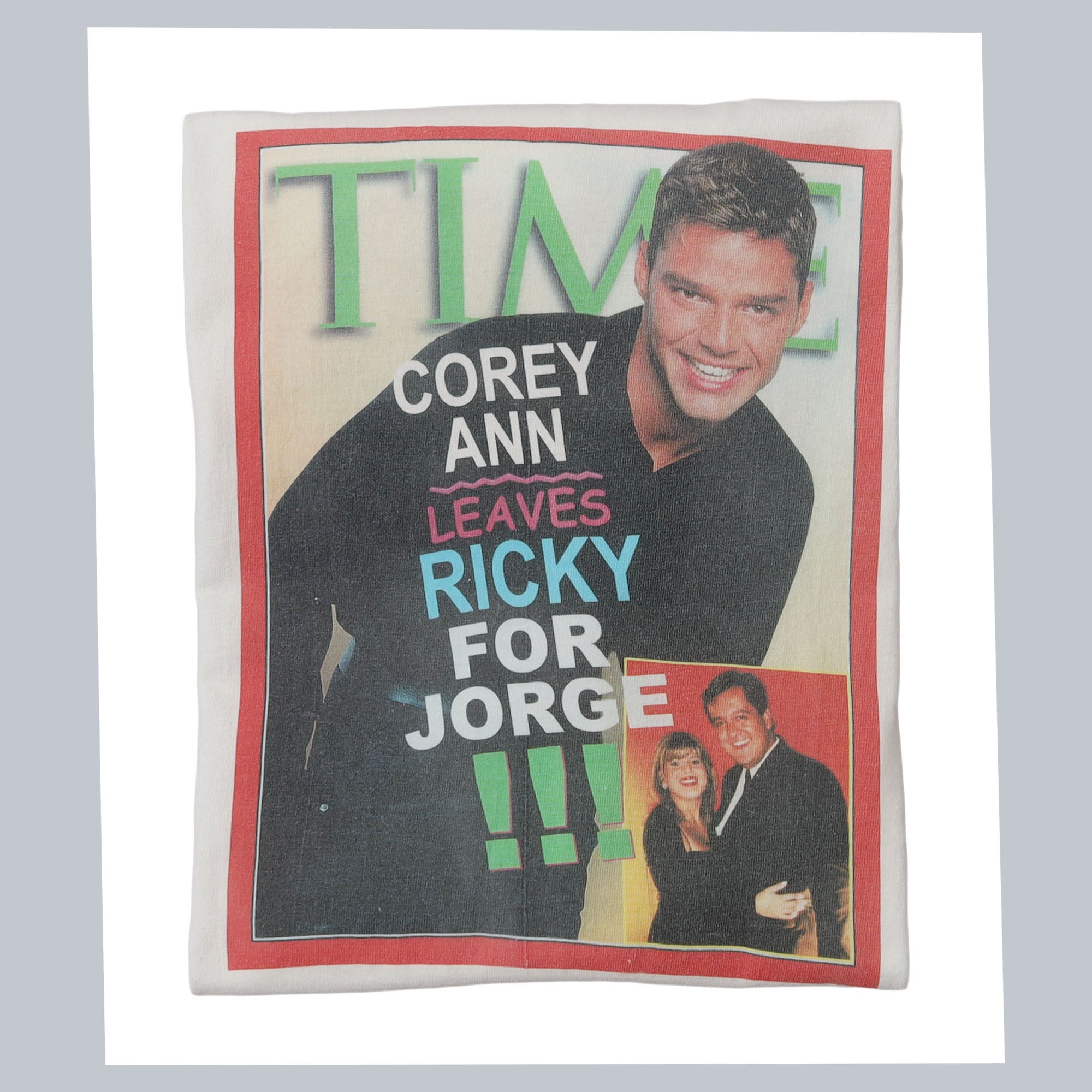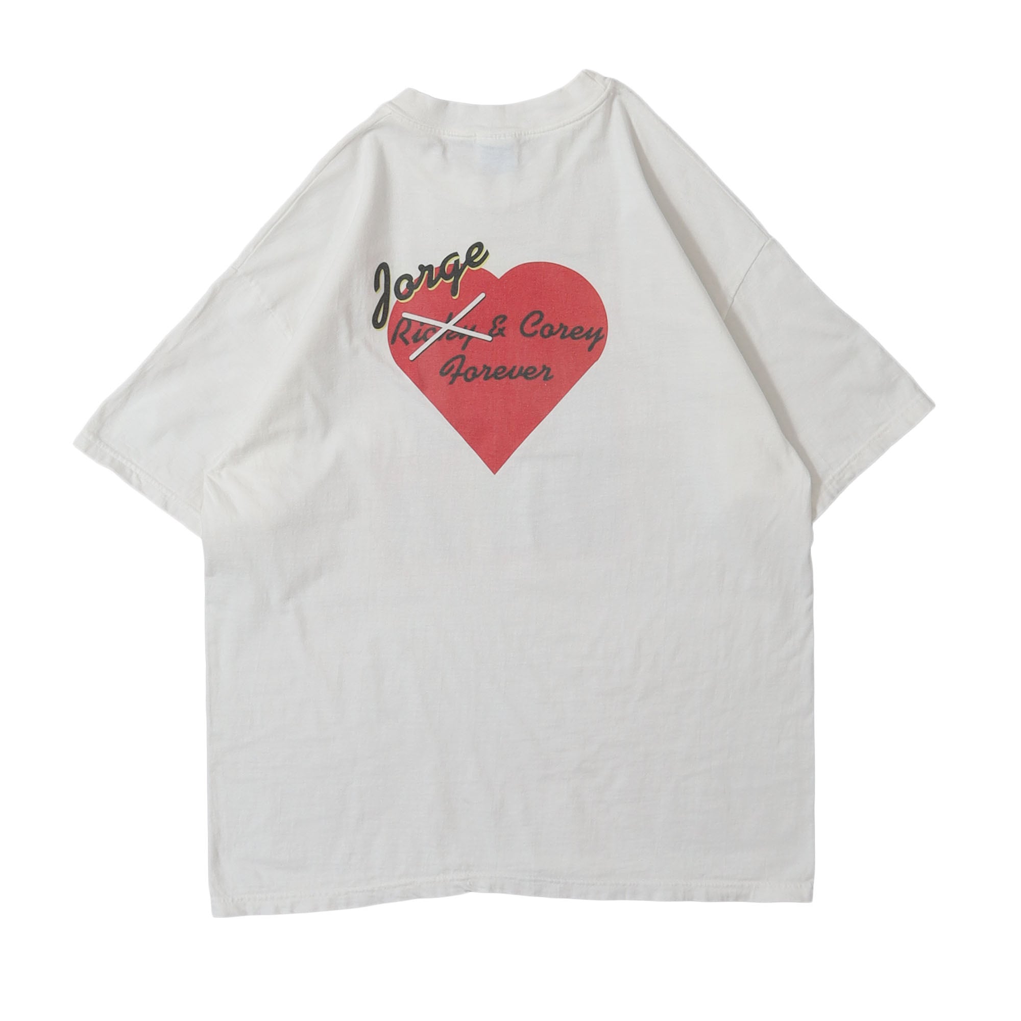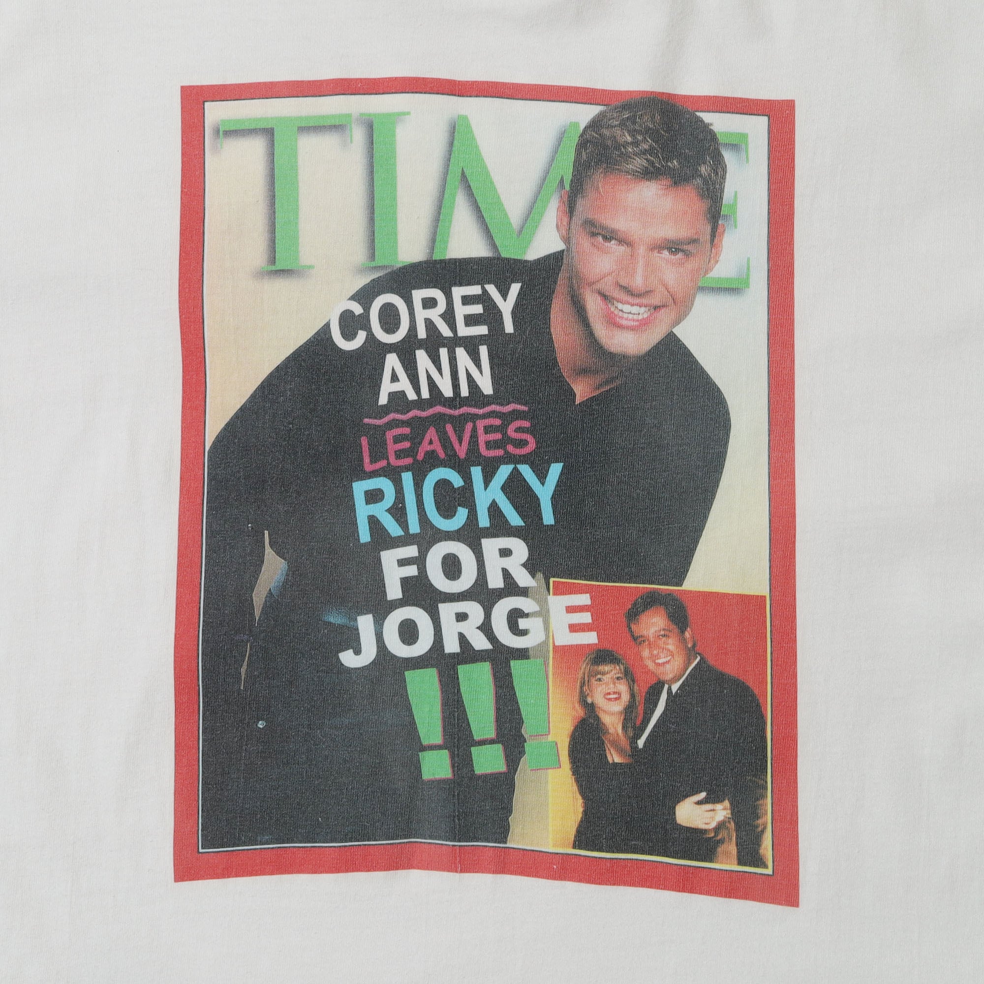 アメリカのニュース誌 "TIME" のTシャツなのか、パロディのTシャツなのか。プリントされている人も、記載の人物も誰だかわからないので詳しくは不明ですが、誰かが誰かと別れて、別の誰かとくっつきましたよってことですね。フロントもバックもとてもいいプリントで、非常に古着らしいというか、古着でしか見つからないようなデザインが魅力的な1枚です。