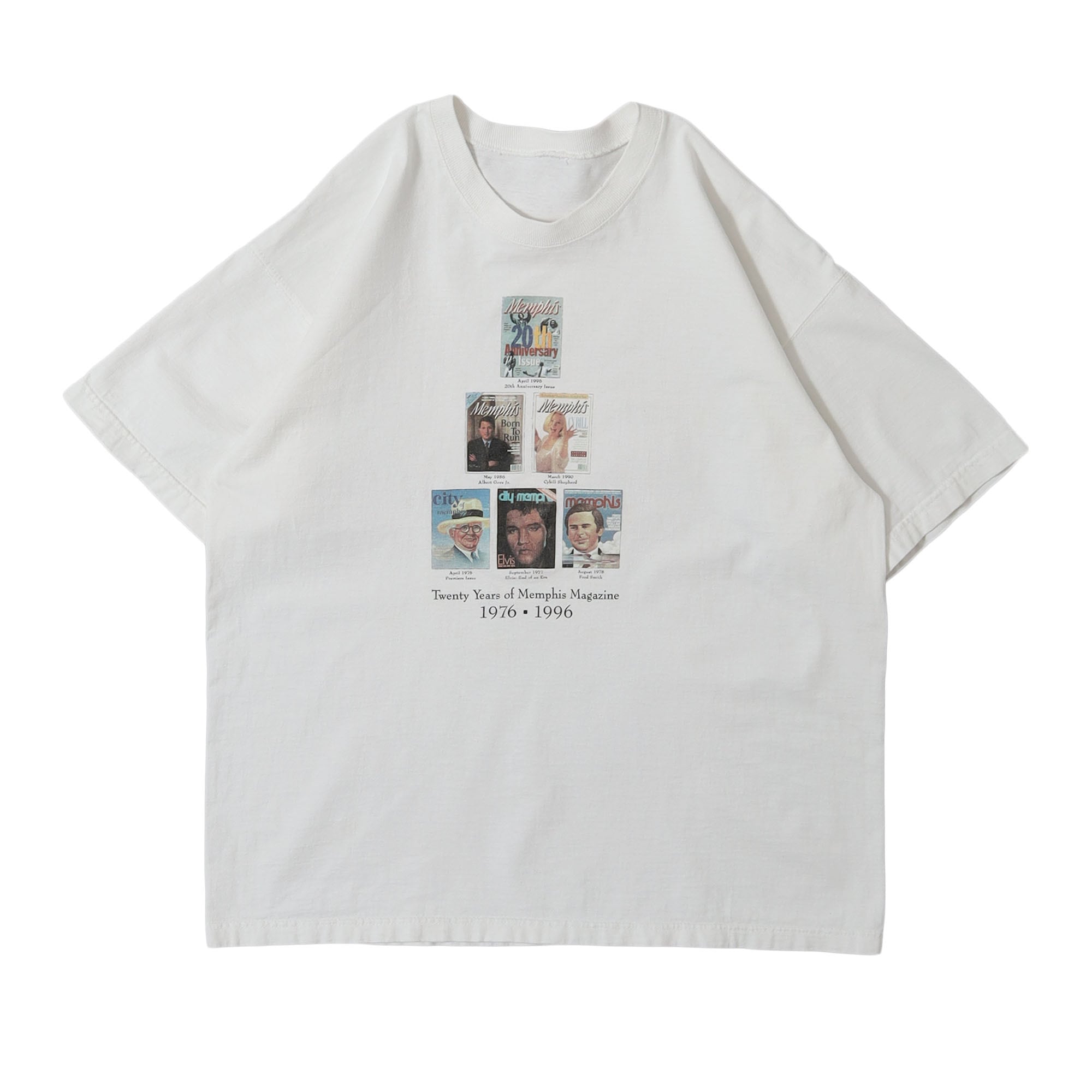1976年創刊の "Memphis Magazine" のTシャツです。ピックアップされた何冊かの表紙がプリントされたデザインですが、あまり見ない雰囲気のデザインかと思います。全体的にスッキリした感じのバランスですが、シンプルすぎず唯一無二の雰囲気がとても洒落た1枚です。